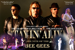 Stayin' Alive is a Canadian production of the Bee Gees. Their look and vocals will take you back in time when the bee gees ruled the pop charts with songs such as "Night Fever, Jive Talking, More than a Woman" to "You Should be Dancing".